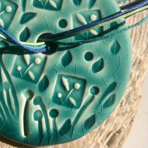 A nyaklánc négyféleképpen variálható: hordható hosszan, vagy a medált középre húzva, a hengeres gyönggyel rövidre gombolható, illetve a medál vagy mintás türkizzöld, vagy megfordítva egyszínű zöld.