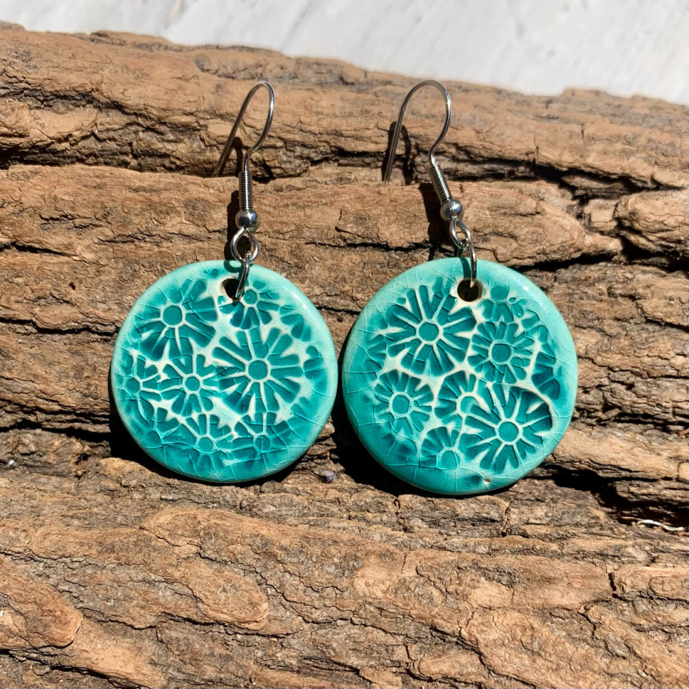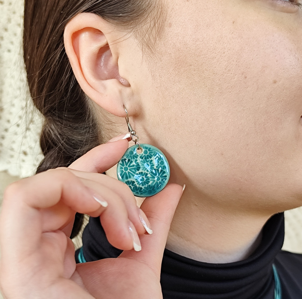 Hűsítő türkizzöld, lógós fülbevaló, a mesés virágos mintával.