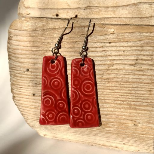 Piros, szögletes fülbevalón élénk karikák kavalkádja.