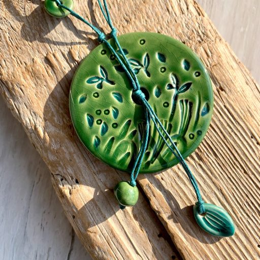 6,5 cm átmérőjű mázas kerámia medál és kisebb-nagyobb kerámia gyöngyök, viaszolt zsinór