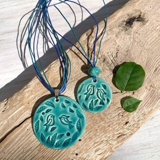 4,7 vagy 3,3 cm átmérőjű kerámia medál, viaszolt zsinór.