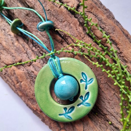 Nyaklánc: 4,5 cm átmérőjű kerámia medál, 90 cm viaszolt zsinór (csúszóhurokkal rövidíthető)