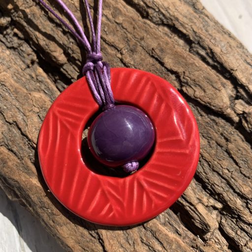 A nyaklánc medáljának izzó piros vonalai között egy játékos lila golyó pajkosan hintázik.