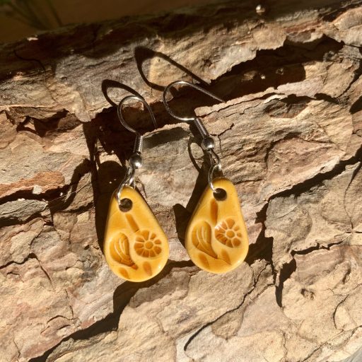 Napsárga, lógós fülbevaló levélkés, virágos mintával.