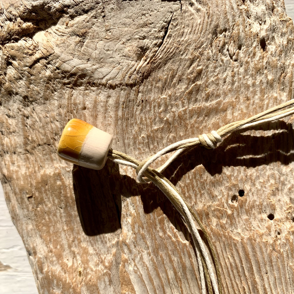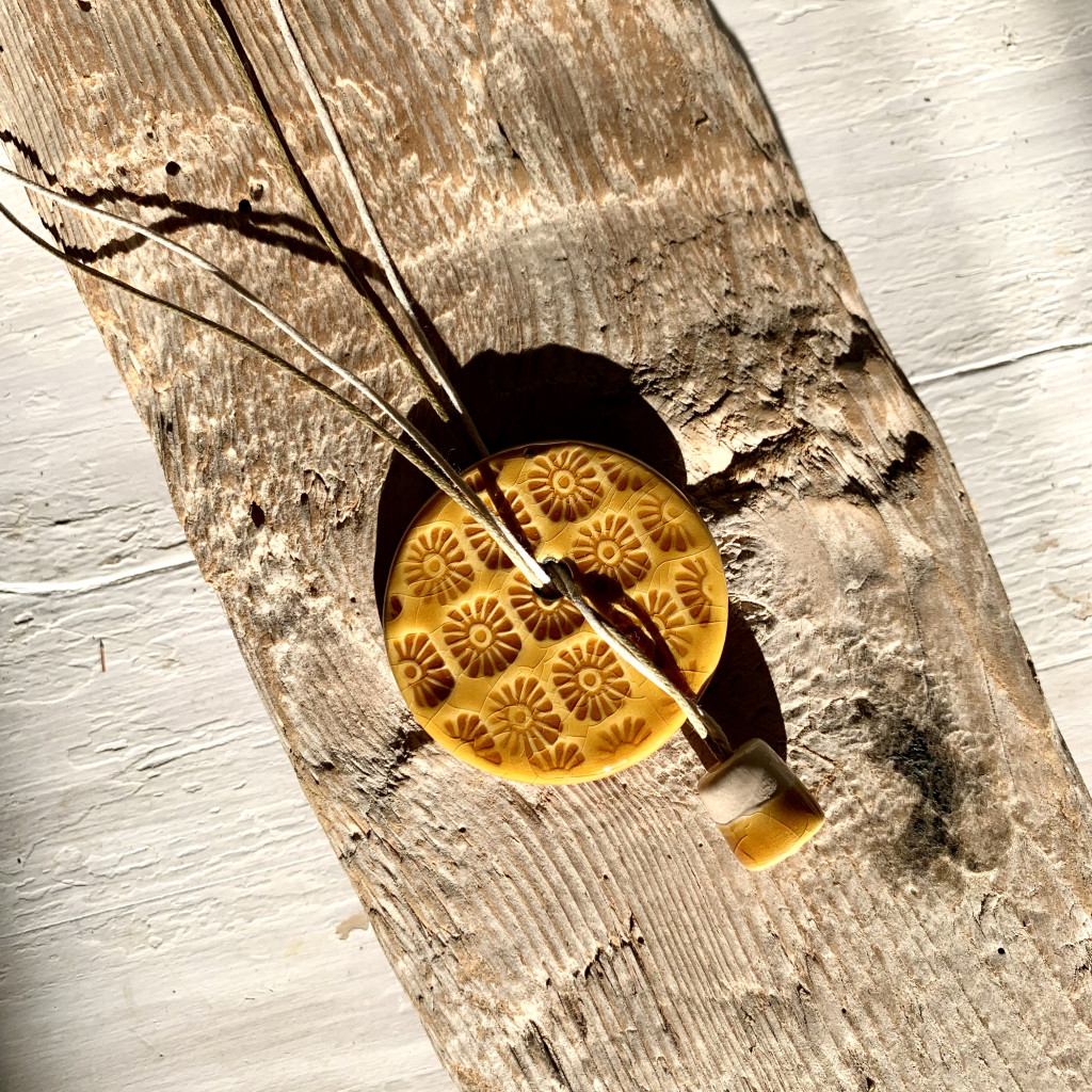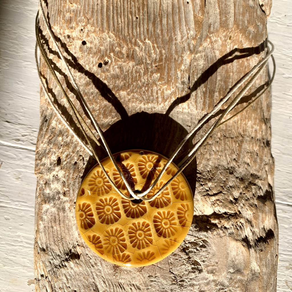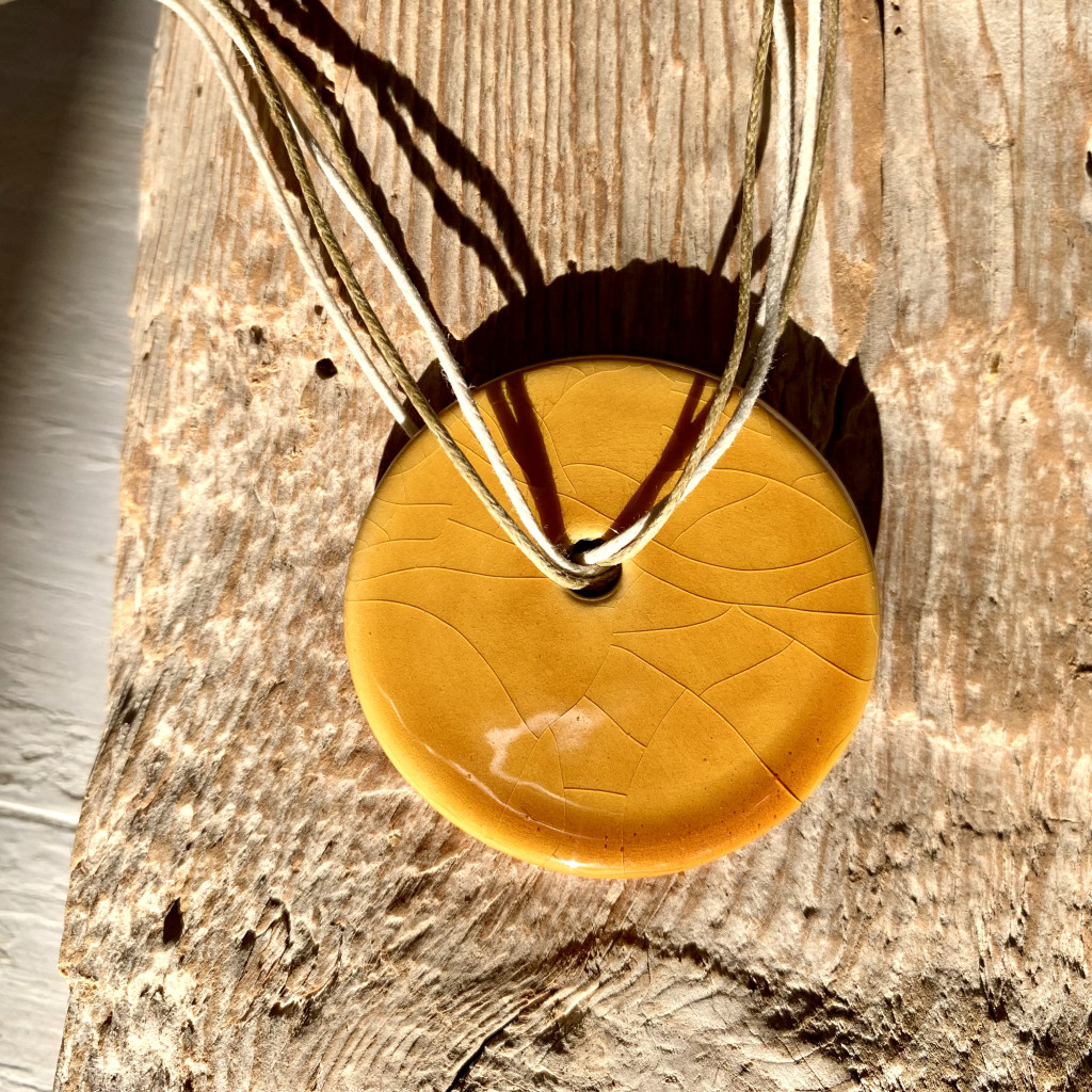 Nyaklánc: 4,8 cm átmérőjű mázas kerámia medál, 90 cm viaszolt zsinór (a nyaklánc hossza röviden hordva: 45 cm, hosszan hordva: 90 cm)