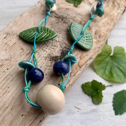 Nyaklánc: 2-3 cm-es mázas kerámia elemek, viaszolt zsinóron, a nyaklánc hossza kb. 100 cm (csúszóhurokkal rövidíthető)