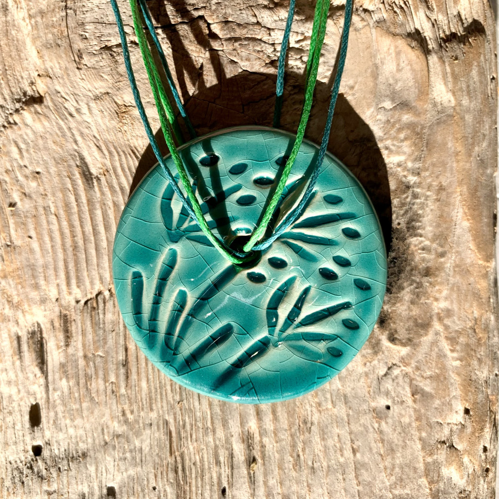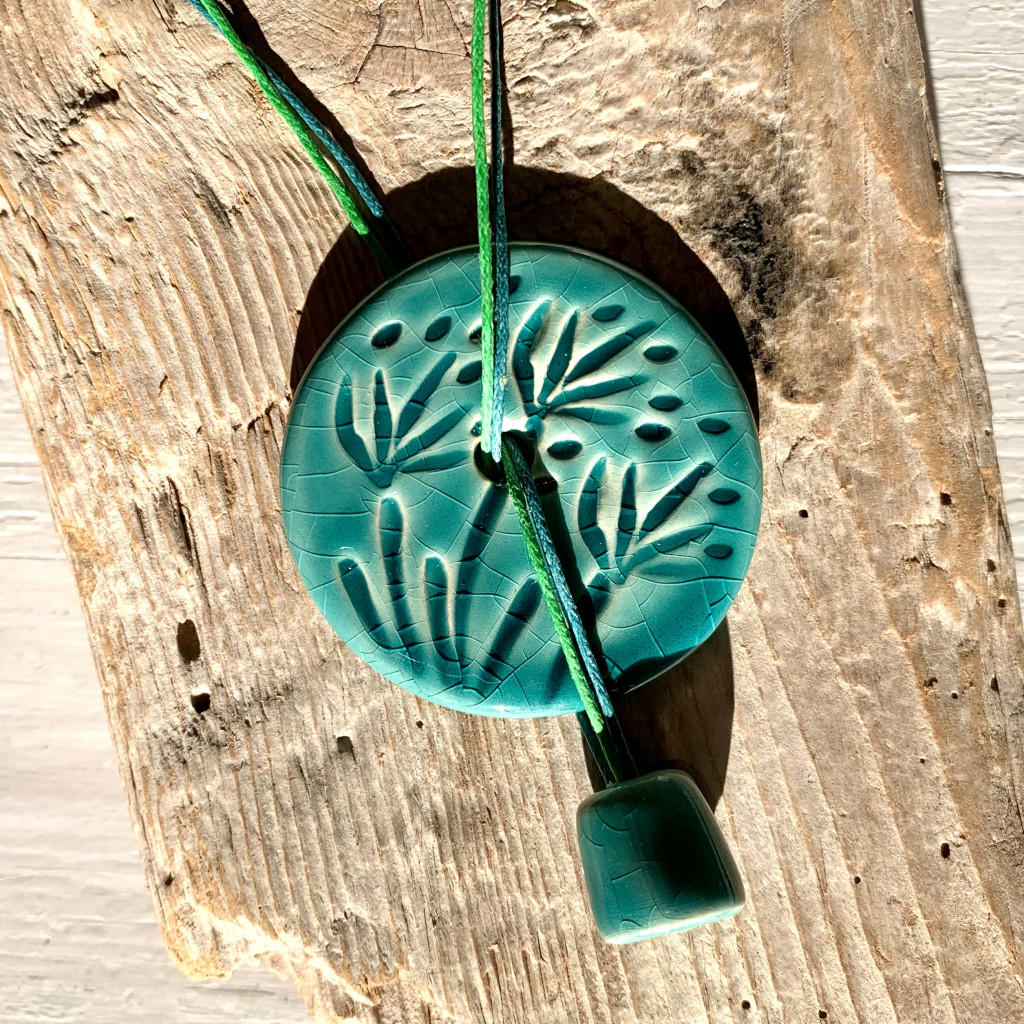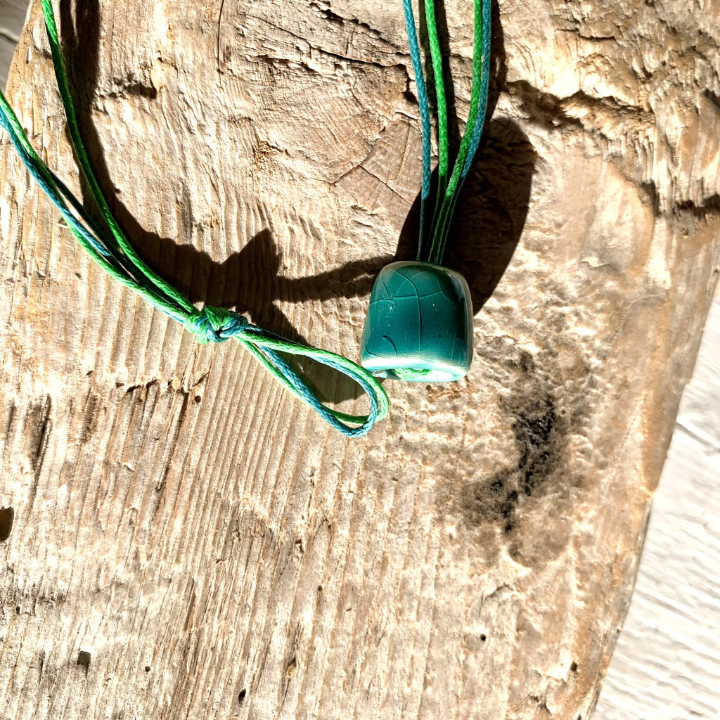 A nyaklánc négyféleképpen variálható: hordható hosszan, vagy a medált középre húzva, a hengeres gyönggyel rövidre gombolható, illetve a medál vagy mintás türkizzöld, vagy megfordítva egyszínű zöld.