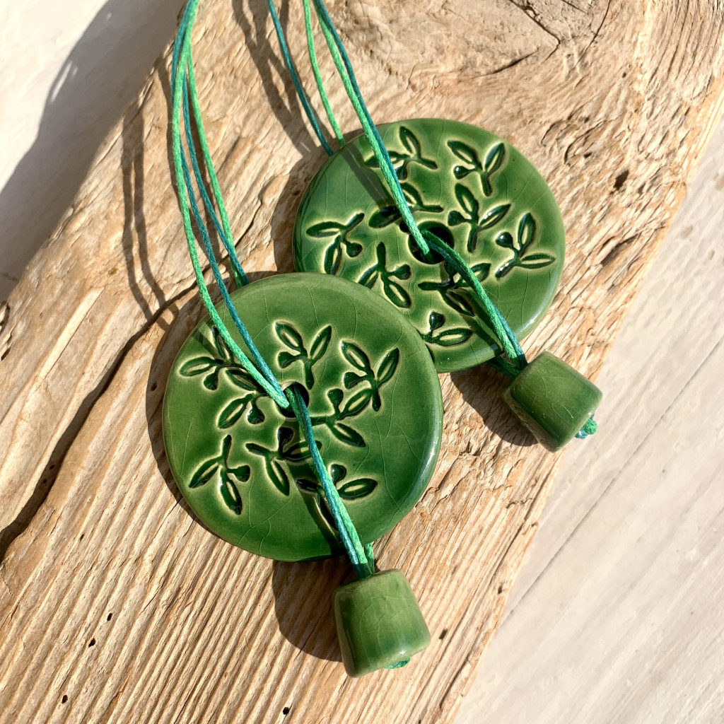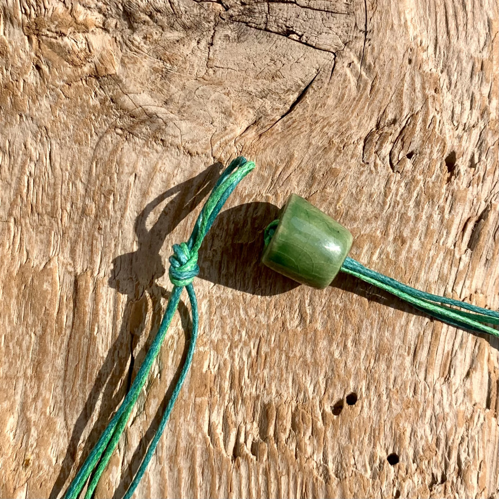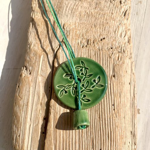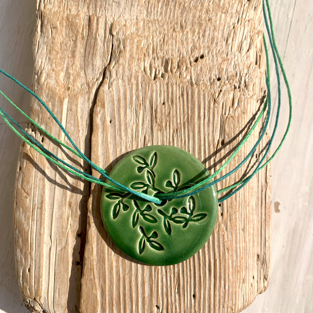A nyaklánc többféleképpen variálható: hordható hosszan, vagy a medált középre húzva, a kis hengeres gyönggyel rövidre gombolható, illetve a medál vagy mintás zöld, vagy megfordítva egyszínű zöld.