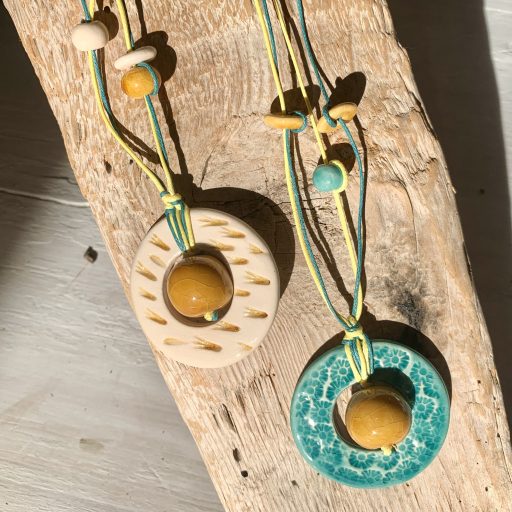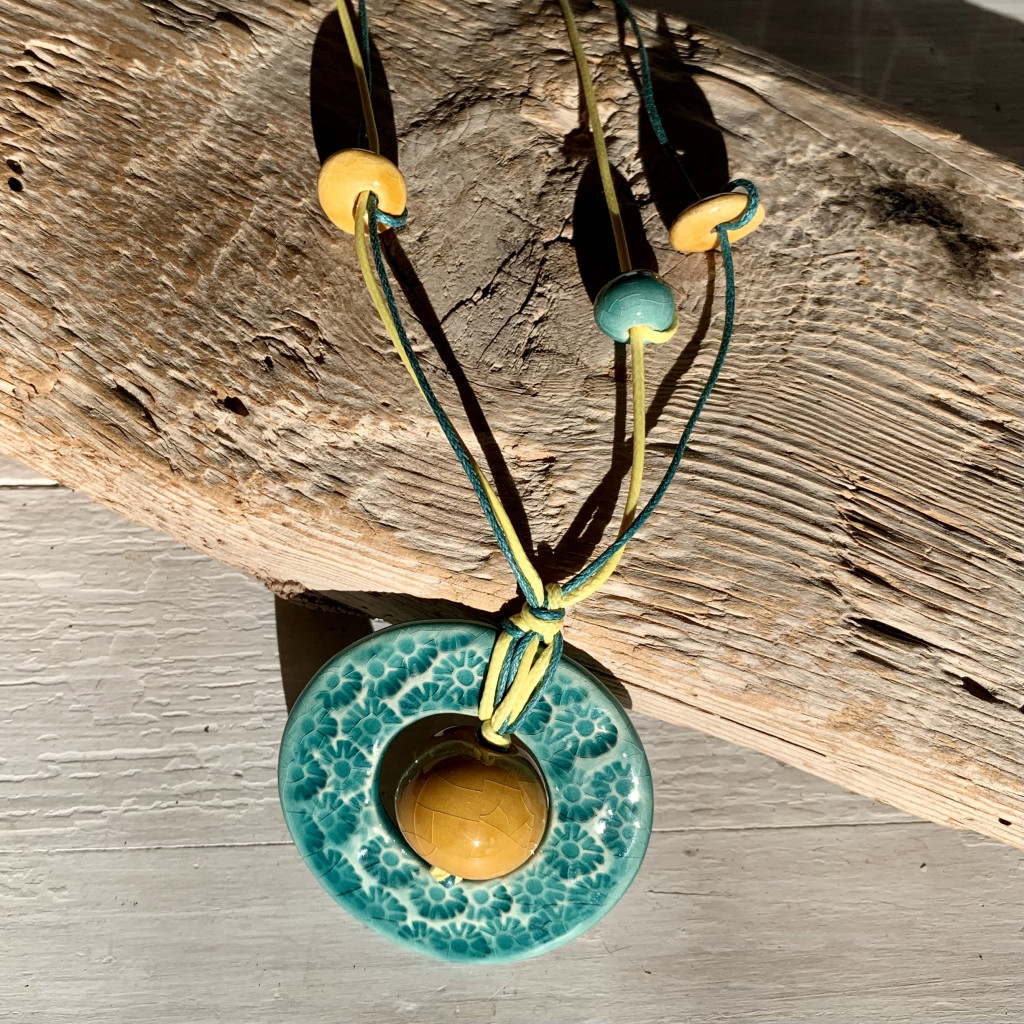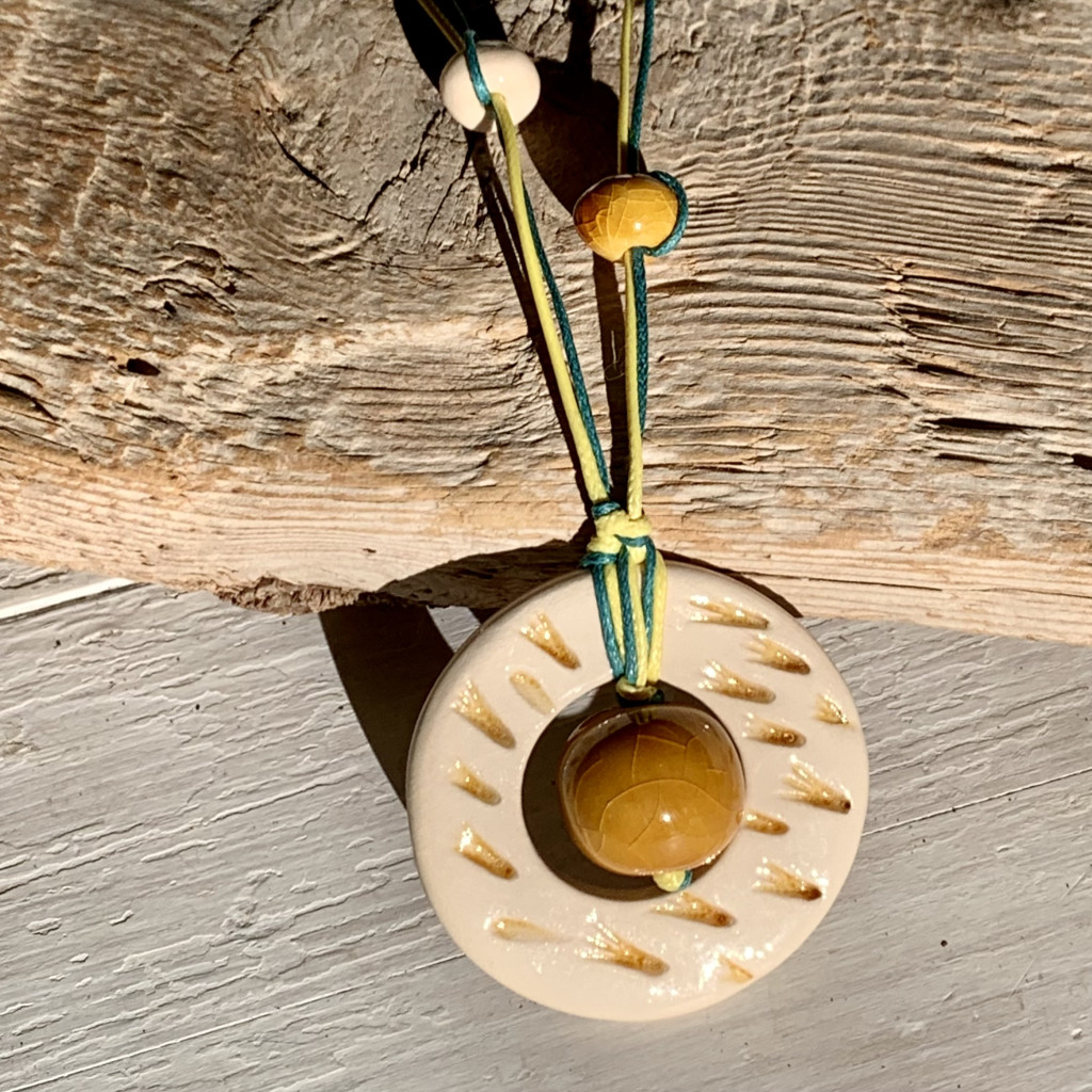 Nyaklánc: 4,5 cm átmérőjű kerámia medál, 90 cm viaszolt zsinór (csúszóhurokkal rövidíthető)