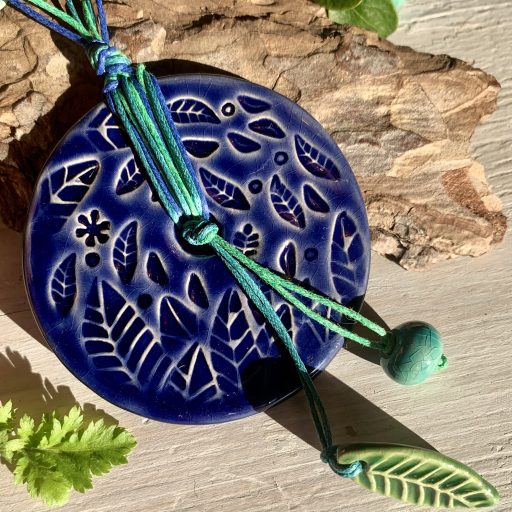 6,5 cm átmérőjű mázas kerámia medál, apró kiegészítő gyöngyökkel, levelekkel,90 cm viaszolt zsinór (a nyaklánc hossza röviden hordva: 45 cm, hosszan hordva: 90 cm)