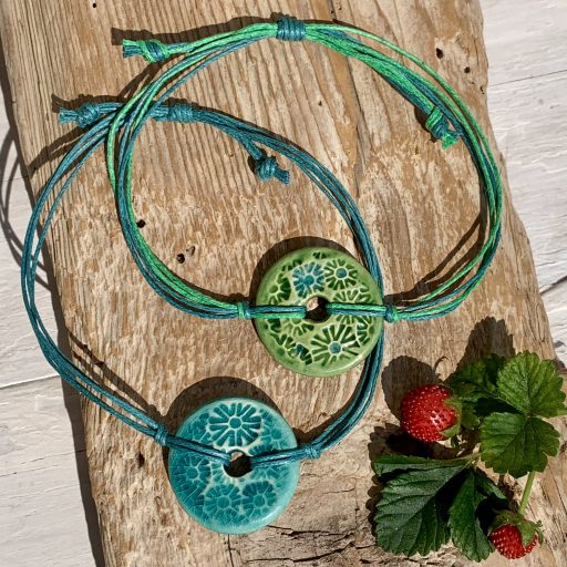 Türkiz és zöld fényben játszadozó borókák karkötőn.