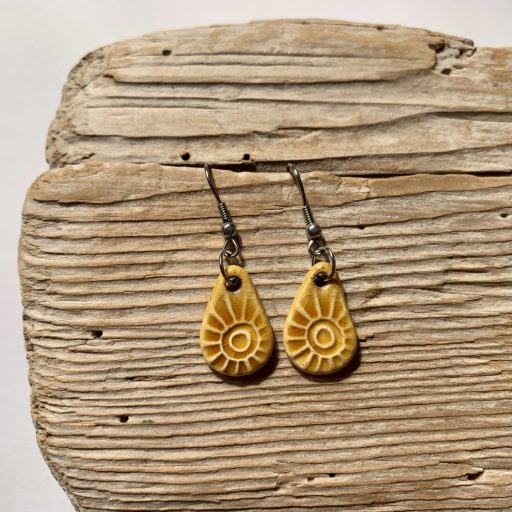 Napsárga, lógós fülbevaló kedves napocskás mintával.