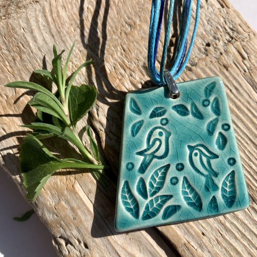 Deep blue square pendant with flower pattern.