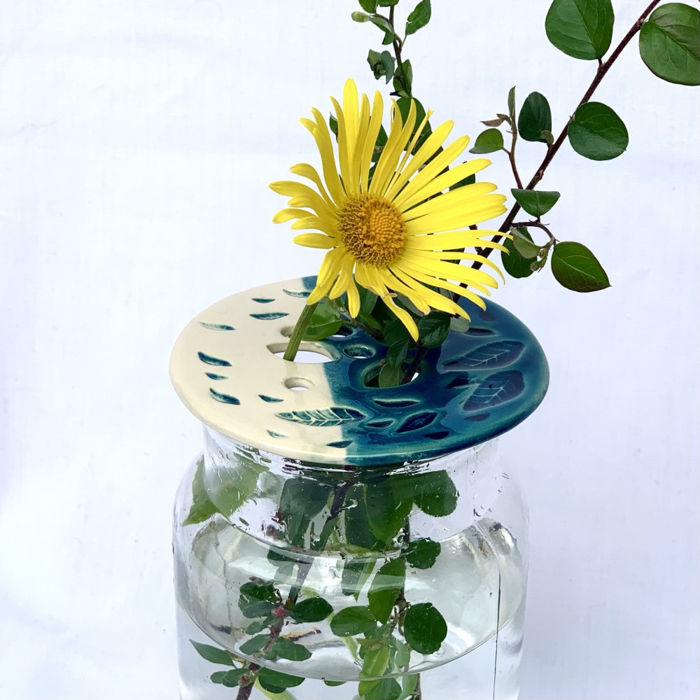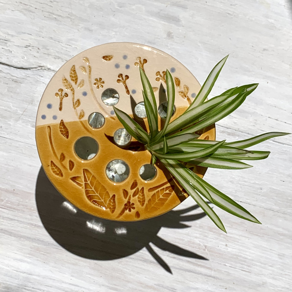 This glazed, ornate disc helps to arrange the flowers into glass and vases.