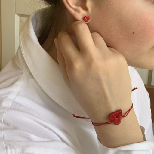 Spark of red embers on stud earrings.
