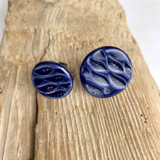 Deep blue, round ring with a leaf pattern.