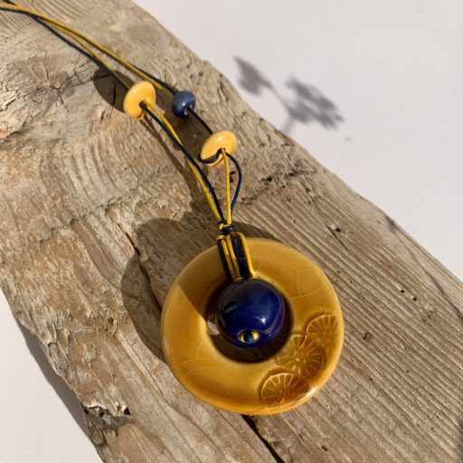ceramic pendant measuring 4,5 cm in diameter, 90 cm string