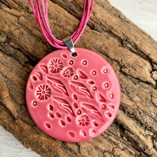 ceramic pendant measuring 4,8 cm in diameter, 46 cm string, plus 5 cm neklace extender