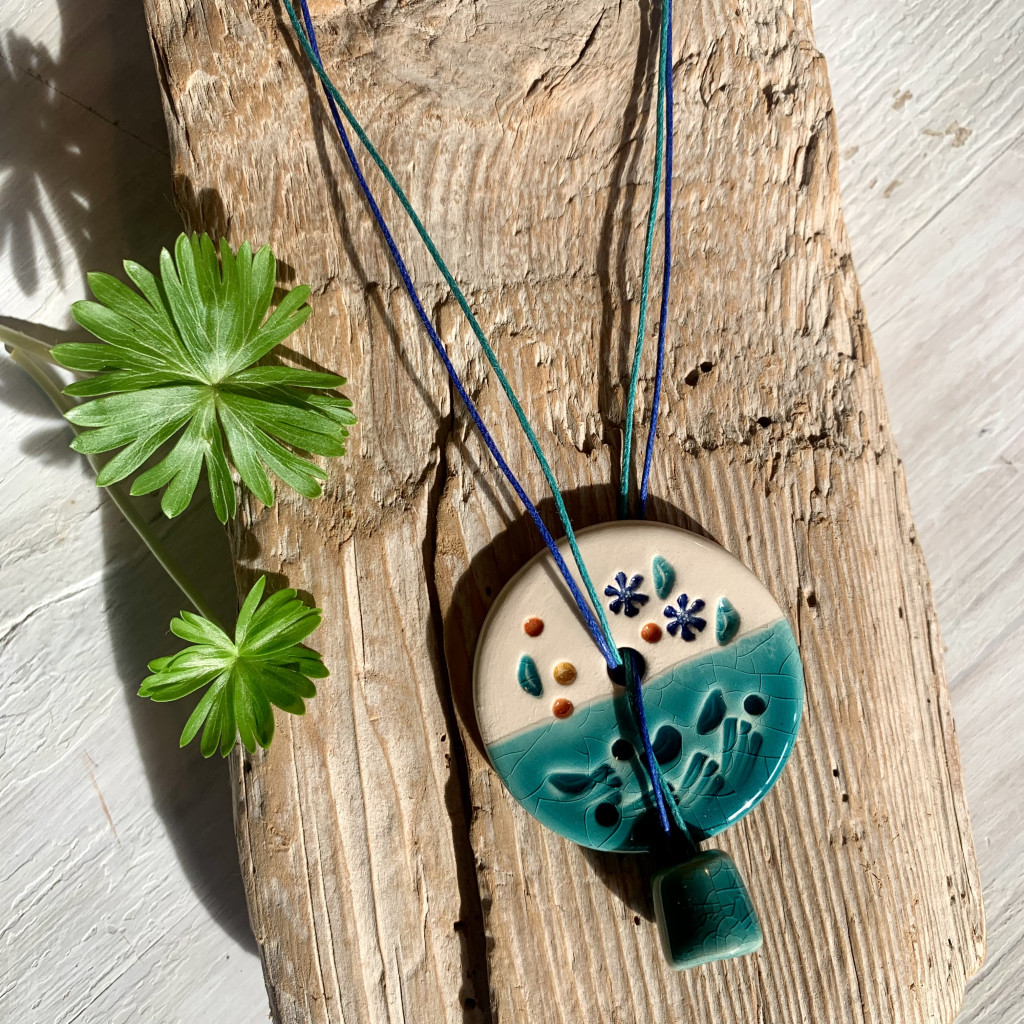 A nyaklánc medálja elől mintás színes, ha öltözéked úgy kívánja, akkor a nyakláncot megfordítva fehér-türkizzöld medálod lesz, így különféle alkalmakra és többféle ruhához is passzolhat a nyaklánc. A fuvallat család több tagját is ajánljuk hozzá kiegészítőnek.